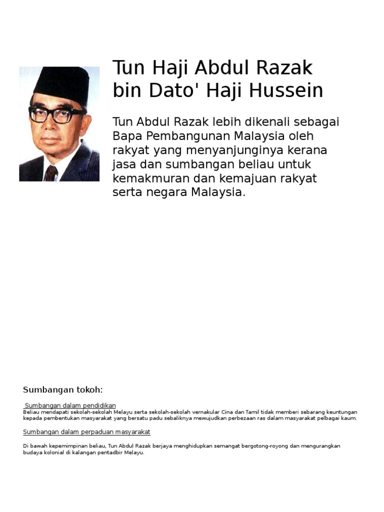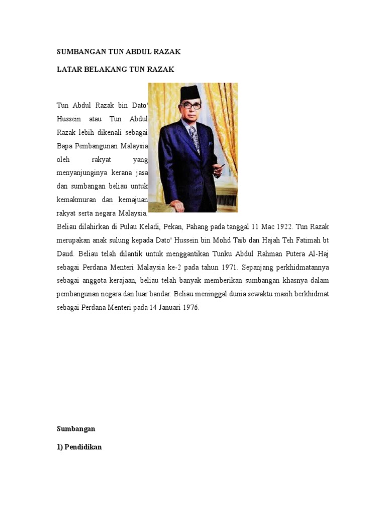 Tun Abdul Razak Docx Latar Belakang Tokoh Tun Abdul Razak Dilahirkan Pada 11 Mac 1922 Di Sebuah Perkampungan Kecil Pulau Keladi Pekan Pahang Beliau Course Hero